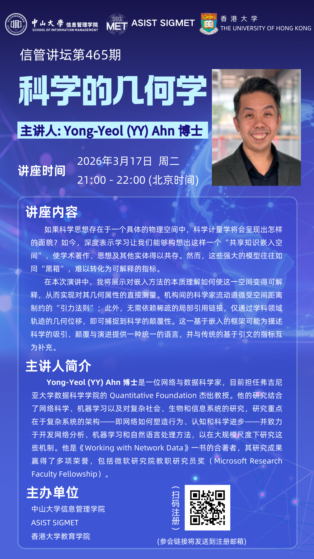 Yong-Yeol (YY) Ahn 博士 是一位网络与数据科学家。他的研究结合了网络科学、机器学习以及对复杂社会、生物和信息系统的研究。他目前担任弗吉尼亚大学数据科学学院的 Quantitative Foundation 杰出教授。在加入弗吉尼亚大学之前,他曾任印第安纳大学 Luddy 信息、计算与工程学院网络科学研究所(CNetS)教授,并曾担任麻省理工学院(MIT)访问教授。此前,他在韩国科学技术院(KAIST)获得统计物理学博士学位,随后在东北大学复杂网络研究中心担任博士后研究员,并在丹娜-法伯癌症研究所系统癌症生物学中心担任访问研究员。他的研究重点在于复杂系统的架构——即网络如何塑造行为、认知和科学进步——并致力于开发网络分析、机器学习和自然语言处理方法,以在大规模尺度下研究这些机制。他是《Working with Network Data》一书的合著者。他的研究成果赢得了多项荣誉,包括微软研究院教职研究员奖(Microsoft Research Faculty Fellowship)。